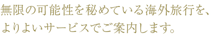 海外旅行を通じて、触れ合うことのできる人々との交流や文化は、無限の可能性を秘めていると思います。10万円の航空券でも、何百万円相当のバリューにつながる体験となることだってありえるのです。帰国後にその見聞は知識となり、さらに価値を高めます。この素晴らしい「海外旅行」というものを、できるだけたくさんの方々に提供したく、私たちは日夜サービスの充実・向上に努める所存です。