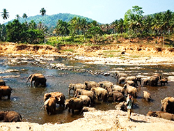 世界中探しても他に見ることができないピンナワラのゾウの孤児院。親とはぐれてしまった赤ちゃんゾウや野生に帰ることができない傷ついたゾウが保護されています。近くには大きな川が流れており、たくさんのゾウが水浴びをする姿は必見です。